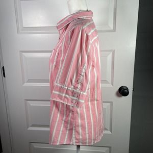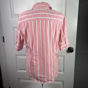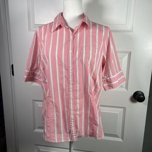 LL Bean Pink Green Stripe Woman’s Blouse Size L Large Short Half Sleeve