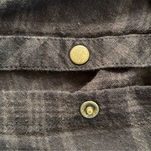 Stylish plaid snap button-up shirt with long sleeves. Features a classic collar and front pockets.