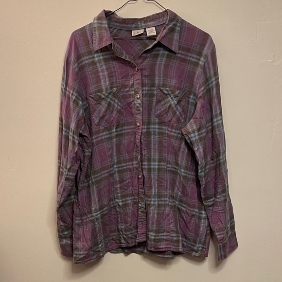 Stylish plaid L.L. Bean button-down shirt. Features a classic collar and button closure. Purple, green and blue plaid. Super soft cotton. Perfect for casual wear. Size large.