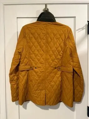 Lightweight quilted jacket with snap and zip front closure. Corduroy collar and side pockets. Plaid interior lining for added style. Very good used condition.