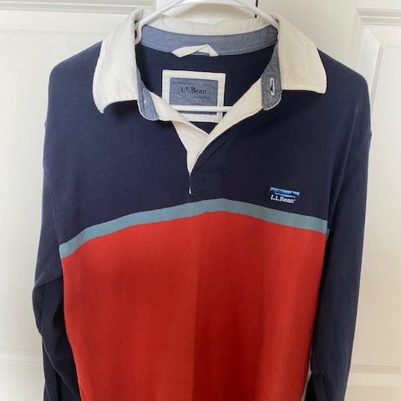 Only worn a few times. L.L. Bean navy, burnt orange color block rugby shirt with light blue chest stripe. Medium size.