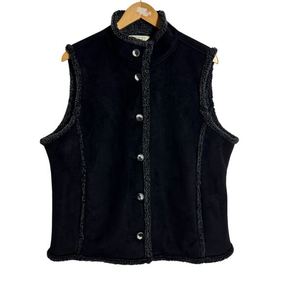 LL Bean Sherpa Lined Vest Women XL Black Faux Suede Button Up Cozy Collared
