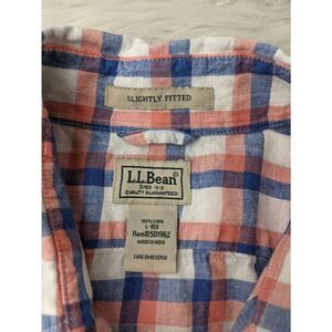 L.L. Bean Shirt Mens Large L Blue White Button Up Plaid Linen Slightly Fitted Casual