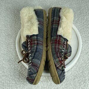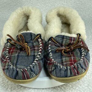 L.L. Bean Shoes Women’s 8 Blue Red Multicolor Plaid Moccasins Sherpa Slippers