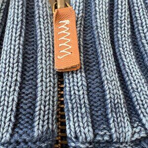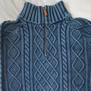 LL Bean Signature Chunky Quarter Zip Cable Sweater in a Medium Blue, Men's XL. This is a substantial, chunky sweater in excellent condition including the leather pull on the zipper that looks brand new. It's 80% cotton with 20% linen which gives it texture. No visible imperfections. The color is a medium "denim" blue. All the original labels are intact. From a pet free, smoke free home.