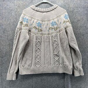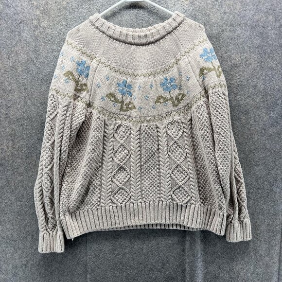 LL Bean Signature Sweater Womens XL Beige Floral Cable Knit Cotton Pullover