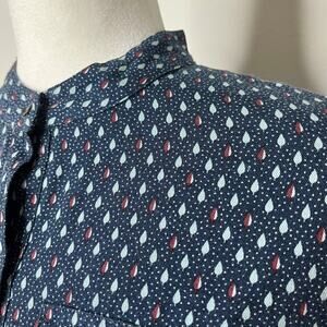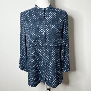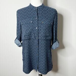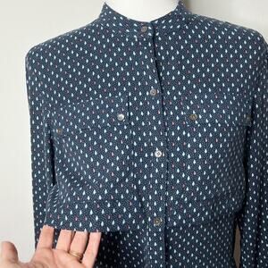 L.L. Bean Signature Womens Button Up Vented Shirt 6 Navy Blue Pattern Tab Sleeve