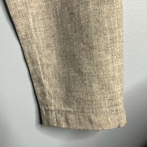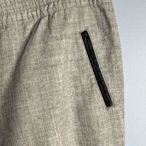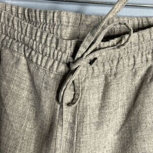 These are so beautiful, dressy, but super comfy!! Elastic waist with drawstring and pockets on the front and back. Pockets are lined with black leather. Legs taper with inseam 28”. Light Grey. Please see care tag when you purchase since they are wool.