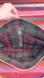 Mustard yellow canvas material, soft plaid interior, back and front pockets, has 2 padded lined pockets suitable for 16 inch laptop or other large electronics