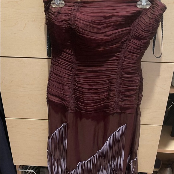 Chic strapless dress in deep burgundy. Features elegant ruching and unique design. Perfect for evening wear.