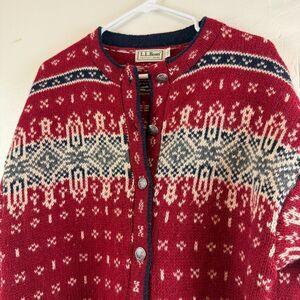 L.L. Bean Sweater Button Up Fair Isle Cardigan Women’s Large Merino Wool Red USA