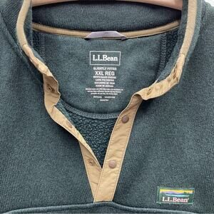 L.L. Bean Sweater Fleece Pullover In Hunter Green. Men’s Size XXL. Slightly fitted. Stay warm and stylish with this green fleece sweater. 4 snap neckline, long sleeves and front pockets. Contrasting trim at neck, sleeves and hemline. 100% polyester. Perfect for casual outings. Excellent preowned condition.