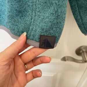 Teal blue and gray sweater fleece snap neck pullover by L.L. Bean. Features a large kangaroo pocket on the front. Very good pre-owned condition. Bust across the front area measures approx. 24 inches.