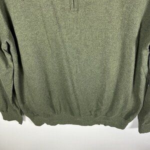 This L.L. Bean sweater is a men's size XL in a solid green color, made from a blend of cotton and cashmere. It features a tight-knit construction with a mock neck and long sleeves, making it suitable for travel and casual wear in the winter, fall, and spring seasons. The pullover style sweater has a 1/4 zip closure and is lightweight, breathable, and stretchy, making it ideal for outdoor activities like walking, golf, casual outings, and hiking.