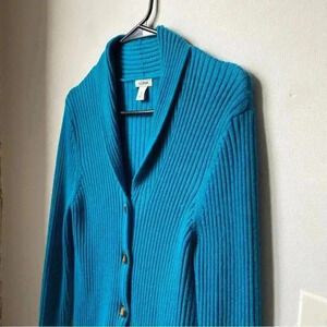 Teal wool cardigan with ribbed design. Button closure. Ideal for layering.