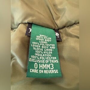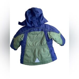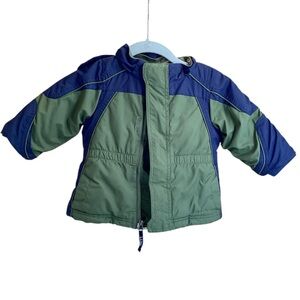 Warm and cozy puffer jacket with fleece inside for extra warmth. Size 12-18 months. Navy and olive green. Zippered front with Velcro for extra warmth. 2 pockets. Reflective logo on back. Some wear per picture on the front right inside - priced accordingly. Not noticeable from the outside.