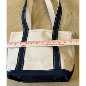 This looks like it was never used. This is old and can tell by canvas. This vintage L.L. Bean boat tote bag is a gorgeous pink cancer ribbon logo tote featuring a distressed finish. Made of sturdy canvas with blue handles and hardware accents, this medium-sized tote is perfect for travel, casual outings, and workwear. The interior includes inner pockets and is eco-friendly, making it a stylish and practical choice for everyday use. The bag is personalized with embroidered details and showcases a solid exterior color with a beige lining, all themed around the USA. Made in the United States, this timeless tote from the L.L. Bean product line is a must-have piece for any woman's wardrobe.