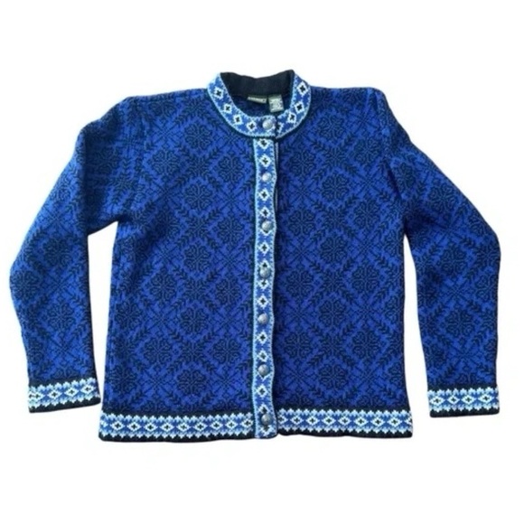Cardigan style knitted Norway sweater quality thick merino wool. NWOT, Size, M-Reg, Colors, blue with black snow flakes, Nordic pattern. Top-rated seller, same-day shipping! Shop my closet for more trendy and vintage items to complement your boho style.