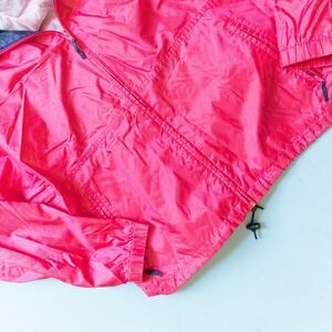 Features: Bright hot pink long sleeve windbreaker style full zip hooded jacket.