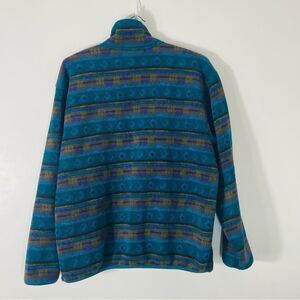 Classic vintage 1990s LL Bean full zip fleece jacket featuring an eye-catching Southwestern/ Aztec pattern in blue, purple, turquoise, and gold.