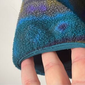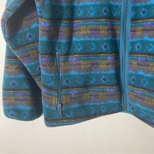 Classic vintage 1990s LL Bean full zip fleece jacket featuring an eye-catching Southwestern/ Aztec pattern in blue, purple, turquoise, and gold.