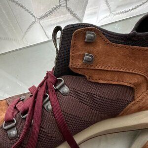 Brown suede and brown mesh construction. A soft suede leather upper also contains rugged knit mesh for ventilation.