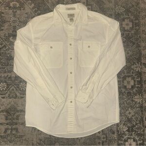 Stylish white button-down shirt. Features dual chest pockets. Ideal for casual wear.