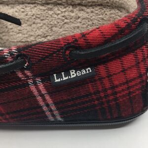 L.L. Bean red plaid wicked good slipper moccasins in a size 9 medium. In excellent Preloved condition. Please see all photos. No materials tag but these feel like a flannel on the exterior and a faux soft Sherpa fleece plush fabric inside. Lots of cushion in these and they have rubber soles,’so you can wear them outside! Pet friendly home.