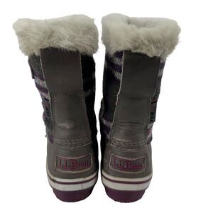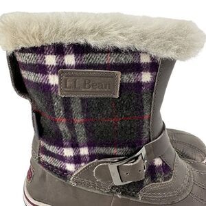 LL Bean Winter Boots Purple & Gray Plaid Primaloft 200 Gram Waterproof Leather and Fabric Upper Faux Fur Lined Buckle Detail Pull On