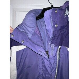This is a women's L.L. Bean jacket in size L, designed for skiing or snow activities. The jacket features a durable nylon outer shell in a solid purple color with a polyester lining and insulation for warmth. It has a full zip closure, long sleeves, and a hood for added protection against the elements. Additionally, the jacket includes pockets for storing essentials while on the go, making it a practical and stylish choice for outdoor winter adventures.