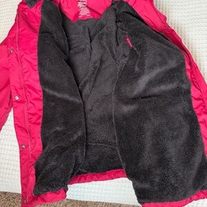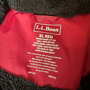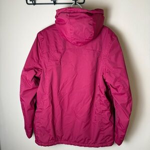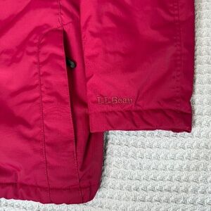 LL Bean women’s Winter Warmer Jacket. Size XL reg. Color is berry pink. Two front zip pockets, one inner zip pocket. Zip front with placket with snap closure. Hood with drawstring. Fleece lined bodice/hood. The outside of the coat is in excellent condition; there is minor wear to the inner fleece lining.