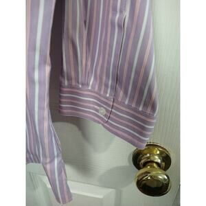 L.L. Bean woman's striped collared wrinkle resistant shirt in good condition. 3/4 button sleeve curved hem. Purple pink white