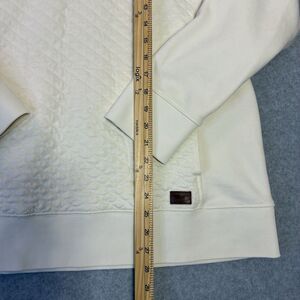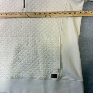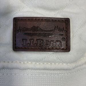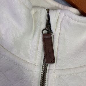 Cozy and classic LL Bean Womens 1X Plus pullover in a soft cream color. Designed for warmth and comfort with a quilted front panel, smooth fleece fabric, and a quarter-zip neckline with faux leather zipper pull. Perfect for casual wear, layering, or lounging in style.