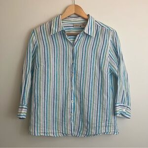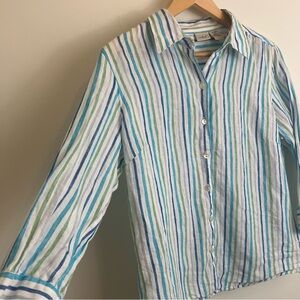 LL Bean Women’s Blue/White/Green Striped 100% Linen Shirt- Sz M Beach Summer