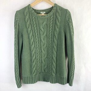 LL Bean Womens Cable Knit Sweater PETITE Large PL Green Fisherman Cotton Chunky