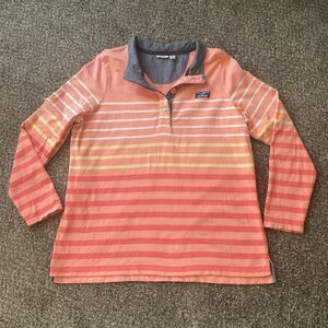 💎LL Bean Women’s Casual Coral Striped Pull Over Long Sleeve Button Neck Size 1X