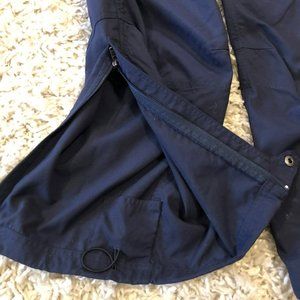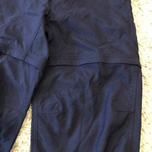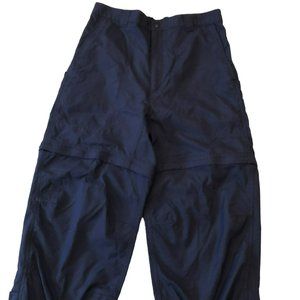 Versatile LL Bean convertible hiking pants for women, size 12. Made from durable nylon, these navy pants are perfect for camping and outdoor activities. Features a comfortable waist and ankle zips for customizable fit and style.