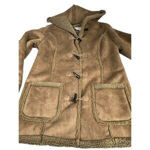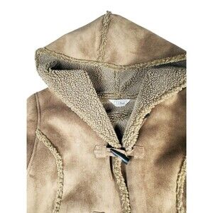 LL Bean Womens Faux Suede Fur Coat Toggle Hooded Sherpa Shearling Sz Med Brown