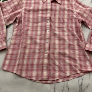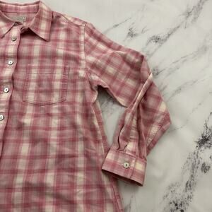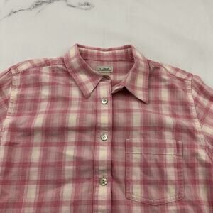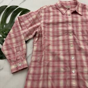 LL Bean women's pink and cream plaid button up flannel shirt, size M. It is free from any rips or stains. It measures about 42 inches around the bust and is about 27 inches long.