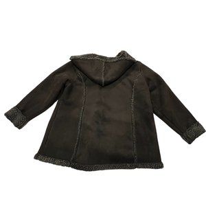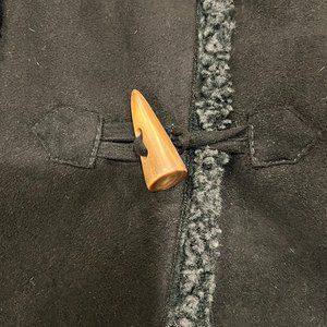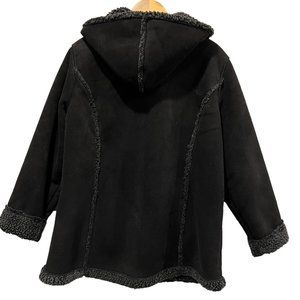 Warm and cozy hooded jacket in a soft and durable microsuede and fleece/sherpa lining. Flattering princess seaming, patch pockets, and large brown horn buttons with loops for closure. Easy wash and wear maintenance. Nice car coat length. Excellent condition. Black with gray fleece lining. Size Large Petite