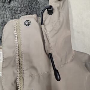 This light brown coat features a comfortable hood and a secure full zip closure.