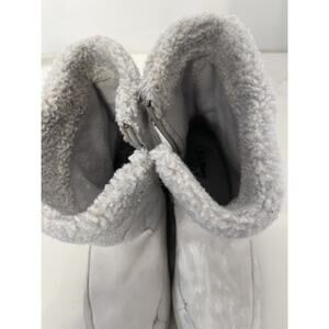 1/2 Quilted outside. Fleece lined. Whitish gray, Side zippers. Heavy tread bottoms. We cleaned them and one has streak marks, otherwise very good condition, hardly worn. We are a size 7 narrow and they fit tightly with medium weight sock. Will fit less snugly on a size 6.5 M, we think.