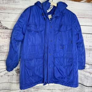 Durable and versatile L.L. Bean jacket in a vibrant blue color. Features multiple front utility pockets, full zip with snap closure, and attached hood for all-weather protection. A great outdoor coat for hiking, casual wear, or everyday use.