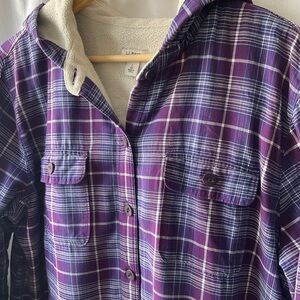 Chic Shacket Fleeced Shirt Jacket plaid design with a cozy hood. Ideal for casual wear in good preowned condition!