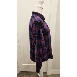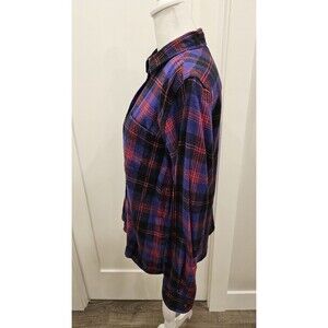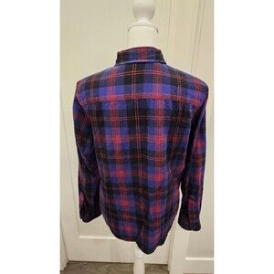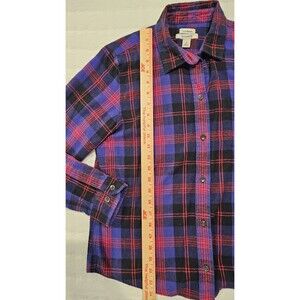 The LL Bean Womens Relaxed Fit Scotch Plaid Flannel Tunic Shirt in size S petite is a stylish and comfortable top perfect for the winter and fall seasons. Made from cotton flannel fabric, this long-sleeved shirt features a collared neckline, button closure, and relaxed fit. The basic and versatile design, along with the purple plaid pattern, make it a great addition to any woman's wardrobe. Ideal for casual wear, this shirt is a classic choice from a reputable brand like L.L. Bean. P2P @ 17", Length @ 24".