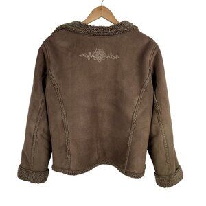L.L. Bean Womens Sherpa Lined Tan Faux Suede Jacket Sz XL w/ Floral Embroidery