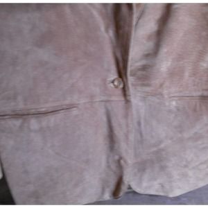 Vintage Suede Leather Single Button Blazer. Women's Size 12 Petite. Measures approximately 19" across the bust, 17" long measured from under arm to waist, and 22" long sleeve measured top of shoulder to wrist. Needs dry cleaned. Has a small spot on the sleeve. Please see pictures.