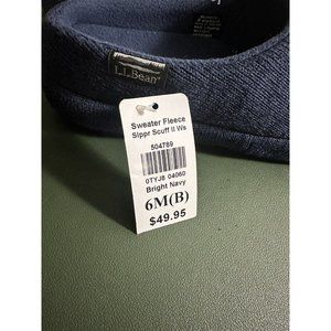 LL Bean Women's Sweater Fleece Slipper Scuff II in size 6M (B) features a round toe, slip-on style, blue color, fleece fabric, rubber outsole, comfortable foam insole, and a classic design. Suitable for casual wear in winter, summer, fall, and spring. This slipper is from the Sweater Fleece collection and is a slip-on type with a solid pattern, ideal for women looking for cozy footwear.