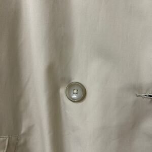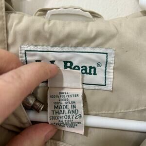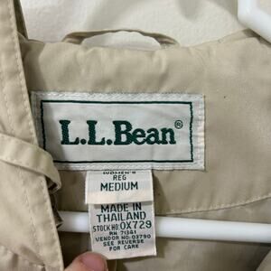 L.L. Bean Womens Sz Medium Tan Vented Button Down Belted Trench Coat Outdoors. The shell is 100% polyester and the lining is 100% nylon. It measures about 23 inches from armpit to armpit and the length from shoulder to hem is about 36 inches. There is a small mark on the front, but in overall excellent condition.