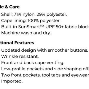 Style: #252299, Tropicwear shirt, long sleeve, lightweight, UV protective, UPF 50+ sun protection and high performance, quick drying, slightly fitted, falls at hip, front and back cape venting, Two front pockets, tool tabs and eyewear loop,
